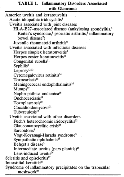 In large reviews of uveitis patients, the reported prevalence of secondary glaucoma ranges from 9.6% to 23%.3–5 Although all types of ocular inflammation can lead to glaucoma, it is seen most frequently with iridocyclitis. In a study of 1254 consecutive patients at a uveitis clinic,3 glaucoma was seen most frequently with anterior, chronic, and granulomatous disease. Of those with glaucoma, 67% had anterior segment inflammation, 4% had intermediate uveitis, and 13% had posterior uveitis. The remaining patients had panuveitis. In this study, the types of uveitis that were most likely to result in glaucoma were secondary to herpes simplex and herpes zoster (22% developed glaucoma), Fuchs' heterochromic iridocyclitis, Vogt-Koyanagi-Harada syndrome, juvenile rheumatoid arthritis (JRA), syphilis, and sarcoidosis. Table 1 outlines the many types of uveitis reported to be associated with secondary glaucoma.