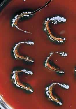 | Certain other Gram-negative organisms also have been known to cause corneal ulcers. Both Neisseria gonorrhoeae and Neisseria meningitidis are infrequent causes of ulcerative keratitis. Either may invade intact corneal epithelium after untreated or inadequately treated conjunctivitis. Most enteric bacteria are aerobic, non-spore-forming, gramnegative rods that may rarely cause keratitis. Klebsiella pneumoniae, Escherichia coli, and Enterobacter aerogenes can produce indolent corneal ulcers that are usually seen in debilitated or immunocompromised patients or in corneas with an underlying pathologic condition.4 Haemophilus aegyptus and Haemophilus influenzae are rarely isolated causes of more virulent corneal ulcers.4 These organisms often grow at the border of colonies of Staphylococcus (satellitism) and have become increasingly resistant to ampicillin. Aeromonas hydrophilia is a Gram-negative rod commonly found in water, soil, and food, and it also has been reported to be a causative organism in ulcerative keratitis.87 Shigella and Salmonella also are rare causes of microbial keratitis in the United States.88 |