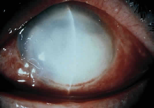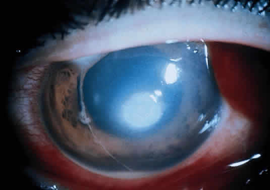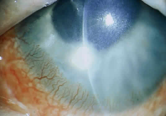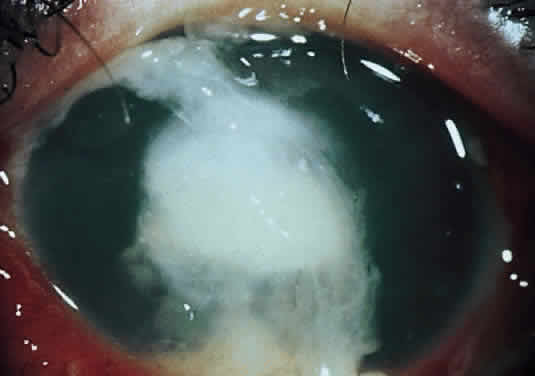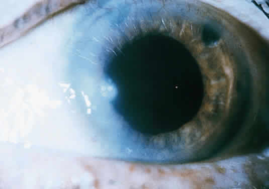 Streptococcus viridans (alpha streptococcus), although of low-grade pathogenicity, may be a cause of corneal ulceration, particularly in the locally immunosuppressed host.42 The organism produces a characteristically indolent, anterior stromal inflammatory reaction that is slow to progress and that may be accompanied by a minimal to moderate anterior chamber reaction. The ulcer is usually well circumscribed, gray-white, “dry” in appearance, and lying beneath a well-demarcated epithelial defect (Fig. 6). Because the organism is of relatively low-grade pathogenicity, the infection responds rapidly to specific antibiotic therapy.