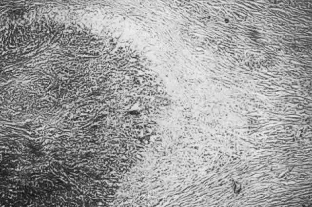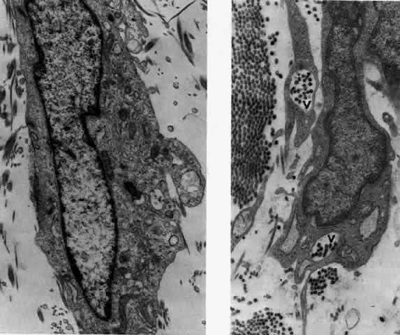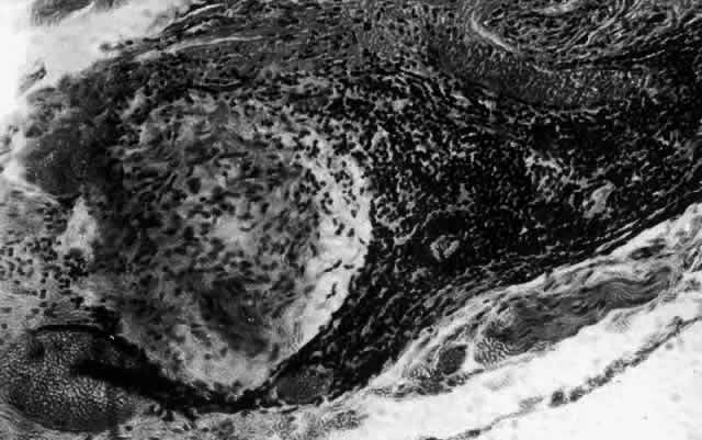 What is clinically represented solely by inflammation and edema is histopathologically a granulomatous lesion of the sclera, the center of which consists largely of plasma cells, lymphocytes, and mast cells (Figs. 21 through 23). Foster and colleagues have identified the cellular subsets and glycoproteins in both necrotizing and non-necrotizing scleritis.22 This shows an active T-cell inflammatory response with a high CD4/CD8 ratio and increased HLA/DR and CD14, indicating a macrophage-induced response that would lead to granuloma formation. Remote from the granuloma, the fibrocytes of the sclera become activated, the proteoglycan adjacent to them becomes altered, and the collagen fibrils of the sclera become unraveled (Figs. 23 and 24). These changes appear to take place prior to the invasion of the stroma by cells of the granuloma.20 The vessels in and around the necrotic area show medial necrosis and perivascular cuffing with lymphocytes, and endothelial swelling with microvascular occlusion. Ninety-six percent of the specimens examined by Foster and associates show a microangiopathy characterized by a neutrophil infiltrate in and around the vessel wall.22–23 This is most obvious at the center of the lesion where there may be occlusion of the vessel, thrombosis, or even aneurysm formation (Fig. 25). From these pathologic investigations, clinical observations, animal experiments, and the results of fluorescein angiography, it would appear that the scleral inflammation is initiated either by trauma (be it accidental or surgical)23–25 or by bacterial or viral infection. If circulating immune complexes are present because of the poor blood flow, they become precipitated in and around the vessel walls in the area of inflammation. In other patients, a persistence of tissue damage will lead to autoimmunization. Damage to the endothelial cells of the microvasculature leads to changes within the vessels detectable on angiography and to catabolic changes in the surrounding tissues. These changes, in turn, allow the granulomatous response that is seen in histopathologic sections, the first detectable change being in the scleral fibrocytes and the proteoglycan and collagen remote from the site of cellular infiltration.