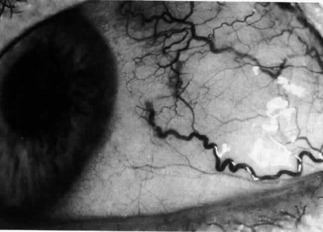 The direction of flow, the distinction between arteries and veins, and the integrity of the circulation can be determined only by the use of anterior segment fluorescein angiography.4,5 |
