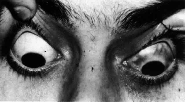 Glaucoma often occurs secondary to scleral disease. Applanation readings should be undertaken at the first visit and subsequently during treatment, especially if corticosteroids are used. Direct and indirect ophthalmoscopy are performed. This is particularly important in all cases of posterior scleritis or if cells are observed in the anterior or posterior chamber. Some patients with scleritis have granulomatous changes in the posterior segment that give rise to an exudative retinal detachment. Posterior scleritis and orbital disease such as pseudotumor, both of which involve the sclera and surrounding structures, will produce not only proptosis but also limitation of ocular movements. It is worth noting that these lesions can sometimes be completely symptom free even when the patient has developed a complete ophthalmoplegia (see Figs. 53 and 54).