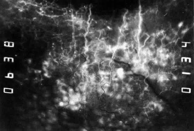 The characteristic features of necrotizing scleritis on fluorescein angiography are hypoperfusion and, eventually, nonperfusion of the vascular networks (Figs. 40 through 43).26 The initial changes are on the venous side of the capillary network; the transit time of the dye increases even if the eye is red and congested. If the disease process persists or has been present for a long time, thrombosis and permanent vaso-occlusive changes occur. These vessels (or the occluded capillary network) are bypassed by the opening of anastomotic channels. New vessels in a granuloma give rise to deep intrascleral leakage of dye (see Fig. 43). Conjunctival and episcleral involvement by the destructive change is late but is always preceded by vaso-occlusive changes that can sometimes be detected with use of the red-free light on the slit lamp (Figs. 44 and 45).