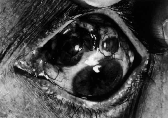 the laceration. All detachment surgeons have reason to know how poorly sclera heals; wounds often open years after surgery or open easily when surgery is repeated. Traumatic wounds, therefore, require careful and exact apposition, reposing or excising uveal tissue between the scleral edges. If strong chemicals, whether acid or alkali, come into direct contact with the sclera, they may destroy the collagen, leading to death of the tissue (Fig. 78). However, the scleral tissue rarely sequestrates but remains to form a matrix on which the fibrous scar forms. Being freely permeable, the underlying choroid is subject to more damage, and the overlying episclera may be totally destroyed. If the exposed sclera is covered by viable conjunctiva or mucous membrane, the sclera may retain sufficient integrity for some scar formation to occur. It is impossible to suture into the friable tissue, and the graft must be anchored elsewhere. Severely damaged sclera can be removed and replaced by donor tissue, which again acts as a matrix for scar tissue. However, an eye so severely damaged as to require this procedure usually becomes phthisical.