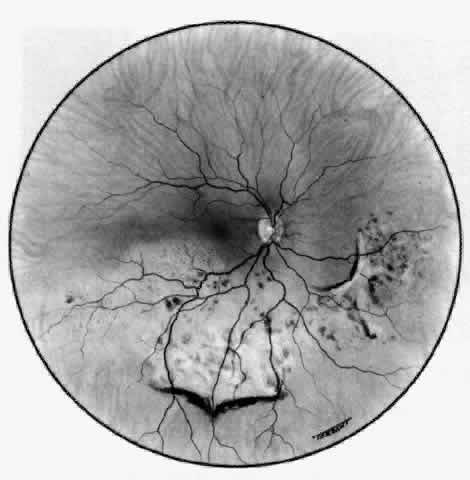 COMPLICATIONS Complications occur late in the disease and vary with the severity of inflammation. They occur most frequently in posterior scleritis and in severe necrotizing disease, particularly when the condition has become circumferential and when the inflammation is so severe as to produce secondary intraocular inflammation. Visual Acuity The object of early diagnosis and treatment is to prevent a decrease in visual acuity. The treatment must not produce iatrogenic changes that cause decreased acuity. Over a 3-year period, approximately 27% of the patients who develop this disease will experience a decrease in visual acuity of two or more lines, which can be the result of cataracts and keratitis developing in patients with severe diffuse anterior scleritis. However, over a 25-year period, only 3% have lost useful vision. Increased Scleral Transparency and Thinning Alteration in the collagen and ground substance results in increased scleral transparency. Scleral thinning occurred, particularly in necrotizing disease or scleromalacia perforans. Of these patients, 22% showed increased scleral transparency after the first attack; however, only 6% developed a scleral defect. If scleral defects are small, they will refill with new collagen after treatment; but if they are very large, they may have to be covered with a graft (see Figs. 63 and 64). Uveitis Although roughly 35% of patients with scleral disease show some evidence of cellular activity in either the anterior or the posterior segment, a severe uveitis with a marked flare and heavy cellular response is very unusual. If it does occur, it is a serious sign, and intensive treatment must be instituted at once with systemic steroids. In posterior scleritis, if the granuloma is behind the equator, there may be little or no intravitreal cellular reaction, even though there is a visible granuloma and a retinal detachment. Scleritis occurring between the pars plana and the equator affects the ciliary body, so some inflammatory response occurs. Unless patients with this form of inflammation are treated rapidly, the intraocular pressure sometimes rises disastrously. Most patients with posterior scleritis have high intraocular pressures at some stage in the disease. As the scleral disease is brought under control, the uveitis resolves, leaving anterior and posterior synechiae unless care is taken to prevent them. The inflammation of the pars plana sometimes leads to massive pigment migration at the retinal periphery, leaving a reaction rather like a diathermy or cryotherapy reaction in retinal detachment surgery (see Fig. 52). Glaucoma The intraocular pressure may become raised at any stage of the disease because of an acute congestion of the outflow channels,27 raised episcleral venous pressure, angle closure, or a steroid-induced rise. Therefore, it is important that the intraocular pressure be monitored; 13.5% of all patients with nodular or necrotizing scleritis had a pressure rise, albeit transient, during the course of the disease. Permanent field changes occurred in 5%. Patients with posterior scleritis are particularly prone to develop rises of intraocular pressure. The treatment of the glaucoma is the treatment of the scleritis. Once the scleritis is controlled, the pressure will fall to normal. While the eye is inflamed, particularly if there is a limbitis, acetazolamide should be used to control the intraocular pressure. Should the pressure remain high after the attack, topical timolol can often help to control the intraocular pressure. If control fails, trabeculectomy can be performed successfully in an area of normal sclera and conjunctiva. Cataract Involutional changes that are already present will be increased by the presence of a severe inflammation. However, there is no doubt that the transparency of the lens can be affected directly in patients who have had previously normal lenses and who have developed severe necrotizing scleral disease. If a cataract advances to the extent that it requires removal, the extraction can be performed with use of a corneal section in spite of the presence of scleritis. Healing is a little delayed in some cases, but no operative or postoperative complications have occurred. Cataract extraction and, for that matter, any other surgical procedure can precipitate scleral inflammation in a patient who is predisposed, usually because of circulating immune complex disease. These patients usually have necrotizing scleritis and require vigorous therapy (Fig. 67).23–25,30–33 Retinal Detachment Exudative retinal detachment occurs in patients who have posterior scleritis, and it may, indeed, be the only sign in a very painful eye. The detachment is poorly mobile. A pale gray granuloma can be seen extending from the choroid beneath the retina and is accompanied by a poorly mobile serous detachment that may become total. The scleral granuloma sometimes leaves a permanent, inward indentation of the retina and a subretinal mass, although this does not always occur. An increasing hypermetropia has also been noted; it is of rapid onset (over a period of 1 week) and is caused by the diffuse scleral edema in the early stages of the disease before the detachment of the retina occurs. The exudative detachment usually resolves completely with treatment of the scleritis. However, if the inflammatory changes have affected the macular area, vision will be severely and permanently affected. After resolution, the retina shows a diffuse, heavy pigmentation of the affected area with a “high-water mark” at the edge (see Fig. 52). Patchy changes outside this area do not seem to occur. Surgery is not indicated. Optic Nerve Swelling Granulomatous processes inside the muscle cone or affecting the optic nerve sheaths may be accompanied by edema of the optic nerve (see Fig. 51). Although it is not possible to make a diagnosis of posterior scleritis on the basis of this sign alone, should there be severe pain, proptosis, li