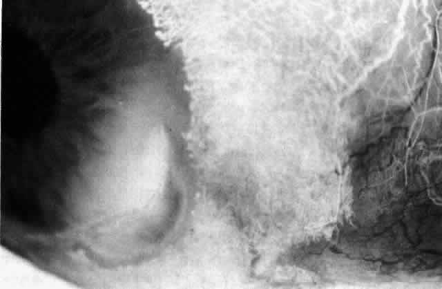 Radiologic investigations should include a chest roentgenogram and a roentgenogram of the sacroiliac joints. Physical examination may not reveal sacroiliitis of the rheumatoid type. Because this may be the only other systemic manifestation in scleral disease, this investigation should not be omitted. Roentgenograms of other joints are taken if a particular disease process such as gout, rheumatoid arthritis, or sarcoidosis is suspected. Prick and patch testing of the skin has been universally unrewarding even when a known sensitizer has been found. Local challenge has been attempted, but the results are inconclusive. Electroretinography and electro-oculography are of assistance only in the presence of cataract or severe necrotizing or posterior scleritis. There is sometimes a dramatic fall in the electric response at the onset of disease and an equally dramatic rise when the disease is suppressed, provided destructive changes have not occurred. B-scan ultrasonography should never be omitted from the examination of patients with scleritis. Now that high-quality ultrasonography has become available, the extent and severity of the inflammation can be determined with great accuracy. Many patients who were formerly thought to have only anterior segment disease have been found to have extensive and sight-threatening posterior scleritis as well. It also has become known that many patients with posterior scleritis with few symptoms and signs have much more extensive disease than had previously been considered possible (Fig. 9). Anterior segment B-scan ultrasonography sometimes reveals extensive involvement of the deep scleral tissue around the ciliary body, indicating the need for urgent and intensive use of immunosuppressive therapy.