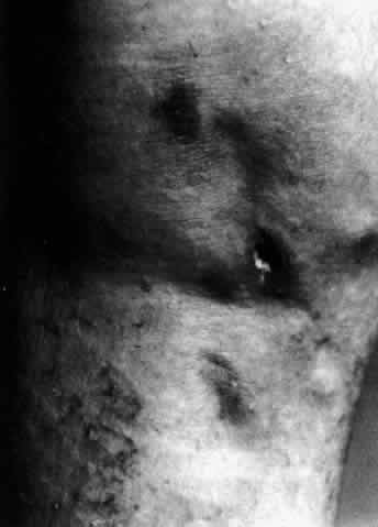Infection around implants used in detachment surgery and stitch abscesses following squint and other scleral surgery are not uncommon, and it is surprising how rarely complications follow. As soon as the offending irritant has been removed, the sclera readily heals without apparent tissue defect. If the irritation is prolonged, a progressive necrotizing scleritis can result. Scleritis from this cause is very persistent and very difficult to treat. Endogenous PYOGENIC. Endogenous pyogenic infections are a rarity, presumably because of the poor blood supply of the sclera. The sclera is so resistant to the pyogenic infection inside the eye that the contents can be eviscerated in patients with panophthalmitis, leaving no infected areas. When, however, a pyogenic infection does affect the anterior sclera, a discharging abscess forms, accompanied by severe intraocular inflammation and occasionally hypopyon. Infection of the posterior sclera is far more difficult to diagnose. The inflammation and pain are intense, the vision invariably reduced, and the eye proptosed, sometimes giving the impression of an orbital tumor. However, very frequently the patient is feverish, the preauricular gland is enlarged and tender, and the lids are swollen. This is a situation that is never found in granulomatous posterior scleritis. Early diagnosis is essential if effective treatment is to be instituted. Provided any abscess is opened and the appropriate antibiotic is given, the results are good. Patients with scleral abscesses that have perforated the wall of the globe with loss of some of the intraocular contents have been known to recover full vision.34 Other organisms known to cause scleral abscesses are Pseudomonas aeruginosa, the streptococci, and Proteus. Fungal infections with Aspergillus in particular are not uncommon, and Acanthamoeba can invade the sclera in a severe infection. In all these instances there is difficulty in deciding whether this is a localized abscess or a severe noninfective scleritis because it is rare for there to be any purulent discharge. It is important to know that infections of the sclera can and do occur. SPECIFIC GRANULOMATOUS CONDITIONS. Whereas pyogenic infections are uncommon, the nonpyogenic granulomatous conditions are common enough to be looked for routinely, particularly because their presentation is no different from that of nonspecific granulomatous scleritis. Although there may be other signs of these infections in the uveal tract, this is by no means universal. Both syphilis and tuberculosis can present with a scleritis. None of the patients we have seen have had any other ocular signs or general symptoms (Fig. 81). The patients with syphilis presented with a diffuse anterior scleritis, and those with tuberculosis presented with a nodular scleritis (see Fig. 34). Caseation is unusual, but perforation is said to occur.35,36 Treatment is with the appropriate chemotherapy and antibiotic, followed by an intensive local steroid regimen to suppress the local inflammatory response.