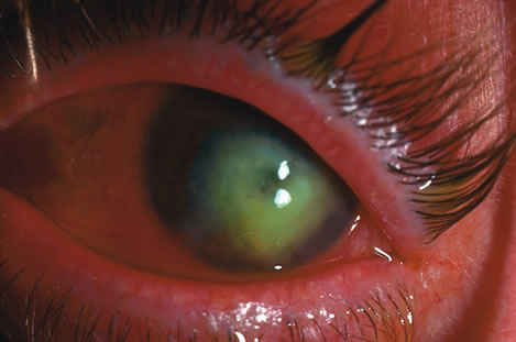Infection is probably the most frequently encountered source of corneal perforation. Direct invasion of microorganisms, proteolytic enzymes elaborated by organisms, corneal cells and inflammatory cells, persistent loss of epithelium, and decreased corneal sensitivity may all enhance the likelihood of ulceration and perforation in the presence of corneal infection. Bacterial, viral (Fig. 1), fungal, and protozoal infections can all result in loss of corneal substance and perforation. A suggestion has been made that the type of treatment of ulcers may affect perforation with an increased perforation rate reported following fluoroquinolone treatment of bacterial keratitis.1