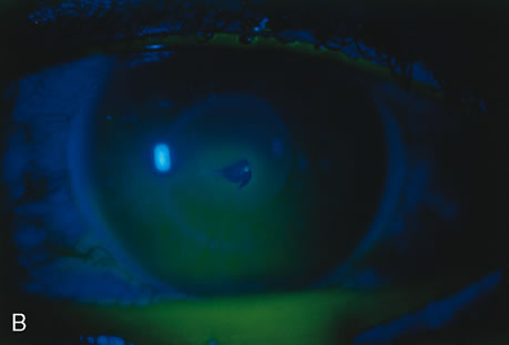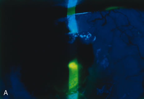 The diagnosis of corneal perforation seems intuitively obvious, but this is not always the case. Usually, shallowing of the anterior chamber is present and a perforation site can be readily seen. However, at times the site of leakage of aqueous may be small or obscured by necrotic, infiltrated, or edematous tissue and the chamber may be only minimally shallow. In this instance, Seidel testing is appropriate. This is done by covering the cornea with concentrated fluorescein, which is quenched or fails to fluoresce. When diluted by a trickle of aqueous humor, however, it fluoresces under cobalt blue light at the slit lamp (Fig. 2A). The same information may be obtained by moistening a fluorescein strip and “painting” the unquenched fluorescein on the cornea and looking under cobalt blue light for a stream of clear aqueous flowing into the green fluorescence (Fig 2B). At times, gentle pressure on the globe may be necessary to demonstrate tiny leaks, and sometimes a flat chamber or iris plugging the leak will lead to a negative test.