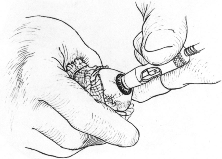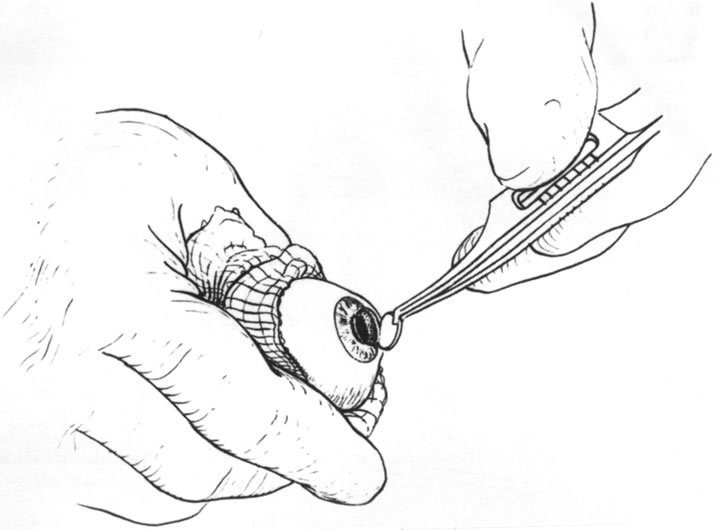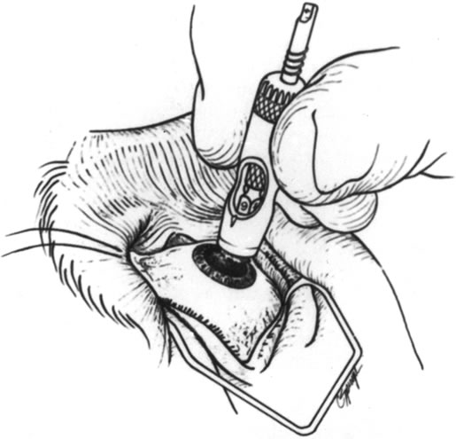 Fig. 5. Using a trephine to surround the area of corneal perforation and necrosis.
