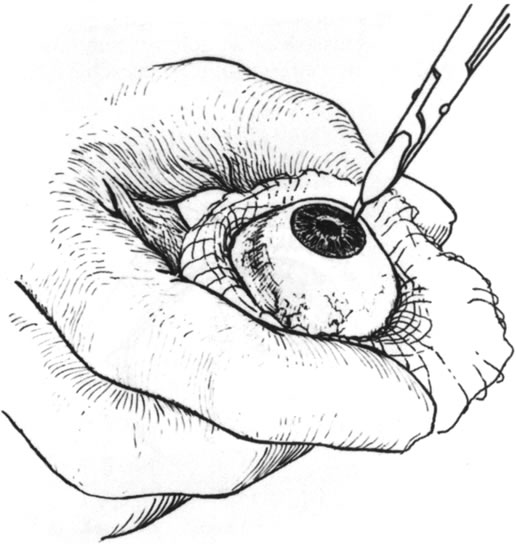 Fig. 9. A sharp blade is used to incise the donor cornea to partial thickness.