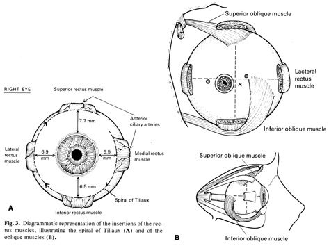 GROSS AND MICROSCOPIC ANATOMY The surface of the eyeball is formed by two spherical connective tissue segments of different sizes, one posterior and the other anterior.21 The posterior opaque one is the sclera, accounting for five-sixths of the eyeball with a radius of curvature of 12 mm. The anterior transparent one is the cornea, accounting for one-sixth of the eyeball, with a radius of curvature of 8 mm. Scleral thickness varies: the thickest part is near the optic nerve (1 mm); it decreases gradually at the equator (0.4 to 0.5 mm), reaching a minimum immediately behind the rectus muscle tendinous insertions (0.3 mm), and increases at the rectus muscles tendinous insertions (0.6 mm) and in the area adjacent to the limbus (0.8 mm). The collagenous fibrils of the rectus muscle tendons interweave with the collagenous fibrils of the sclera making the fusion inseparable. The traumatic scleral rupture usually occurs immediately behind the insertion of the recti, at the equator or in an area parallel to the limbus opposite from the site of the impact.13,22 It is important to remember how thin the sclera is behind the insertions of the recti when tendons must be sutured to the sclera in tendon recessions or advancements as part of strabismus surgery. The rectus muscle insertions are progressively more posterior and follow a spiral pattern described by Tillaux and hence called the spiral of Tillaux (Fig. 3). The medial rectus inserts 5.5 mm posterior to the limbus; the inferior rectus, 6.5 mm; the lateral rectus, 6.9 mm; and the superior rectus, 7.7 mm. The insertions of the superior oblique and inferior oblique muscles are posterior to the equator. The long tendon for the superior oblique muscle inserts superiorly and slightly laterally, inferior to the superior rectus muscle; the line of insertion is convex posteriorly and laterally. The inferior oblique muscle inserts posterolaterally. Because this muscle has no tendon, the muscular fibers attach directly; the line of insertion is convex superiorly and laterally. The most posterior point lies 5 mm temporal to the optic nerve, external to the macula.