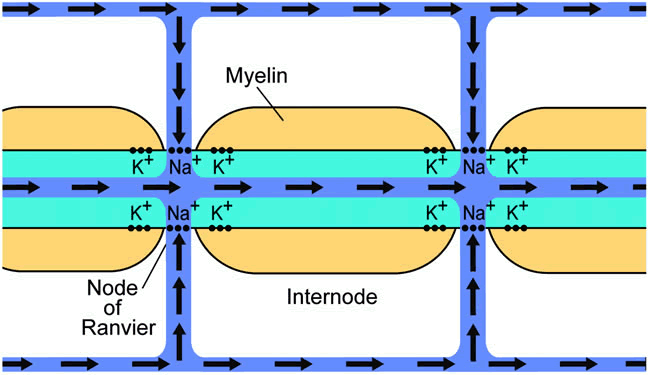 SYNAPTIC TRANSMISSION Retinal ganglion cells receive synaptic input from bipolar and amacrine cells. The bipolar inputs are the results of graded potentials; only retinal ganglion cells exclusively use action potentials (amacrine cells have features of both).34 The synapses from bipolar and amacrine cells primarily use glutamate as the major excitatory neurotransmitter. The retinal ganglion cell synapse on its targets, primarily the lateral geniculate nucleus in higher animals, is glutamate. Within the retina the levels of glutamate are controlled by Müller cells, which have glutamate transporters and also contain the enzyme glutamine synthetase, which converts glutamate to the amino acid glutamine. EXCITOTOXICITY Retinal ganglion cells are particularly susceptible to high levels of glutamate in the extracellular space. This causes cell death mediated via overexcitation, or excitotoxicity. It has been proposed that excitotoxic retinal ganglion cell death may explain pathologic conditions, such as glaucoma or retinal ischemia, in which an excess of retina ganglion cells die, akin to what occurs with cerebral infarct or other diseases. AXONAL CONDUCTION Action Potentials The primary function of the optic nerve is to carry information from the retina to target areas within the brain. Individual retinal ganglion cell axons transmit information via action potentials, which are all-or-nothing spikes of electrical activity. This is in contrast with intercellular communication within the retina, where graded potentials are used to transmit information. The retinal ganglion cells and their axons are the first neurons in the transmission of visual information from the eye to use action potentials as the mechanism for transmission. With action potentials, the actual amount of voltage change (i.e., depolarization) is the same, whereas the number of impulses per second and the distribution of impulses within various axons is the mechanism by which visual information is carried down the optic nerve. Conduction down individual axons occurs via the same biophysical mechanisms that occur in any myelinated axon (see later section on myelin). The mechanism of axonal conduction is straightforward. At rest, the inside of an axon is at a negative voltage with respect to the outside of the axon. This resting potential results from the higher concentration of potassium within the axon than outside the axon. As a few potassium ions flow down their concentration gradient from the inside of the axon to the outside, the movement of positive charge out of the axon results in a negative potential within the axon. Outward flux of potassium continues until the charge separation becomes too great and can no longer be driven by the concentration difference between inside and outside the axon. The point at which the gradient for potassium concentration is balanced by the gradient for separation of charge results in an equilibrium potential for potassium. Although the resting potential is primarily determined by potassium, there is also a smaller contribution from sodium flowing down its concentration gradient. In the case of sodium, the concentration in the extracellular space is higher than within the axon. This concentration gradient would induce sodium to enter the axon, and movement of a few sodium ions results in a positive sodium equilibrium potential. However, in a resting (nondepolarizing) axon the conductance for sodium is much smaller than that for potassium, and, therefore, the final resting potential is weighted much more by the equilibrium potential for potassium than for sodium. During axonal conduction, depolarization of a section of membrane induces opening of voltage-sensitive sodium channels located within adjacent membrane. These allow much greater amounts of sodium to enter the axon, and the positive sodium ions cause the axon to become more positive (i.e., depolarized). In this case, the potential across the membrane is now weighted far more by the sodium equilibrium potential than by the potassium equilibrium potential. The sodium channels open because they are voltage sensitive, and a relatively small depolarization of the membrane will cause them to open transiently. Increased potential within the axon rapidly affects adjacent sections of the axon and causes sodium channels in these adjacent areas of axonal membrane to likewise become partially depolarized. These then completely open and cause a compete depolarization. This chain of events continues down the axon, resulting in a transmission of action potential. Repolarization is the return of the axonal membrane potential to the original (negative resting potential) state and is necessary for more than a single action potential to be transmitted down the axon. Repolarization is due to the closure of the voltage-sensitive sodium channels and a transient opening of voltage-sensitive potassium channels. Once the latter occurs, the membrane resting potential is weighted more by the potassium equilibrium potential than by the sodium equilibrium potential. This results in a restoration of membrane potential to the resting state. In the process of transmission of an action potential there is movement of sodium and potassium ions along their concentration gradients. If action potentials continued indefinitely, the sodium and potassium concentrations would reach equilibrium across the axonal membrane, resulting in loss of their concentration gradients and blocking conduction. Therefore, to re-establish their concentration gradients, there is a relatively slow redistribution process of these ions via the Na+ = K+ = ATPase takes place. This is a highly energy-dependent process and will not happen if axonal metabolism is pathologically disturbed. Role of Myelin Myelin adds an additional complexity to axonal conduction. Myelin has two physiologic properties. It increases the resistance and decreases the capacitance of the axon. The decreased capacitance means