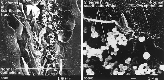 The 7-μm thick tear film is comprised of three layers: lipid, aqueous, and mucoid. These layers are derived from the meibomian glands, the lacrimal glands, and conjunctival goblet cells, respectively.5 Specific antimicrobial components of the aqueous and mucoid layers are discussed later. Lipids confer surfactant properties to the tear film, enhancing its ability to trap microbes and efficiently flush them into the lacrimal excretory system. It is, therefore, not surprising that patients suffering from aqueous tear film deficiencies (i.e., dry eye) are at increased risk for corneal infection. OCULAR EPITHELIUM The ocular epithelial surface prevents intraocular penetration by most microorganisms. This nonkeratinized squamous epithelium, consisting of five to six cell layers, is supported by a columnar basal layer. The basement membrane, with its numerous junctional complexes, presents a nearly impermeable anatomic barrier.6 The outermost layer of the corneal epithelium is covered by a layer of glycocalyx over which lies a layer of mucus. This glycocalyx serves as a scaffold that binds mucin, antibodies, and other tear film components. Specific components of the mucoid tear film are discussed later. Relatively few microorganisms are capable of penetrating an intact corneal epithelium; these include Neisseria gonorrhoeae and Haemophilus aegyptius.4 Even those organisms commonly associated with bacterial keratitis, including Pseudomonas aeruginosa and Staphylococcus aureus, have difficulty establishing infection on an uncompromised ocular surface. Laboratory animal models of bacterial keratitis often require some form of pre-inoculation corneal injury or abrasion (Fig. 1), and/or prolonged contact with the pathogen.7,8 Keratitis caused by yeasts, filamentous fungi, and parasites are almost always associated with corneal abnormalities, injury, or surgery.5 Contact lens wear has also been implicated as a predisposing factor to fungal (predominantly Candida spp.) and parasitic (predominantly Acanthamoeba spp.) keratitis, presumably resulting from microabrasions of the corneal epithelium following prolonged contact with the lens polymers.5 Although little is currently known regarding the molecular mechanism for adhesion and invasion of the cornea epithelium by pathogenic organisms, a reasonable hypothesis may involve the unmasking of previously sequestered host molecules for which pathogens possess specific receptors.9 |