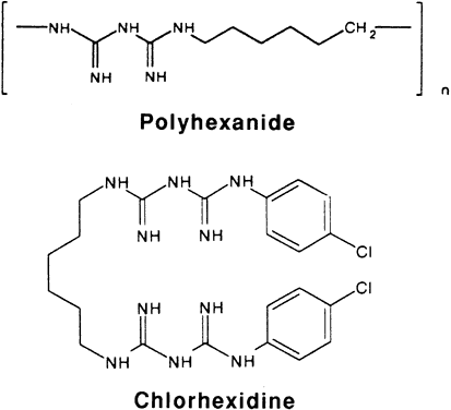 Chlorhexidine was developed by Imperial Chemical Industries in the 1950s.41 When the bis-biguanides such as chlorhexidine were found to be more microbicidal than the monomeric biguanides, polymeric biguanides were developed. Polyhexamethylene biguanide (polyhexanide, PHMB) was developed during the 1960s in several molecular weights.