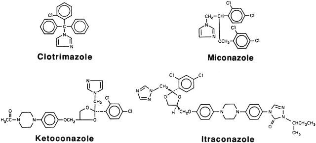 Several imidazole and triazole compounds are commercially available (Fig. 4). Miconazole was available as a 20-mg/ml acidic solution, containing parabens, for intravenous infusion. This preparation has been dispensed, undiluted, in eyedropper bottles for topical use. Clotrimazole is available in dermatologic (Lotrimin and others) and vaginal (Mycelex and others) preparations, but these are irritating to the ocular surface. Topical clotrimazole can be prepared by obtaining the powder, ensuring sterility, and making a suspension in artificial tears.72 Clotrimazole 1% has been prepared from the micronized powder used for fungal sensitivity testing (Schering Corporation, Kenilworth, NJ). The suspension should be shaken before each use and may need to be reformulated every few weeks.