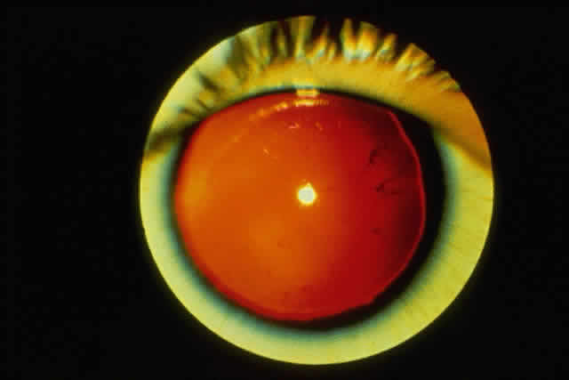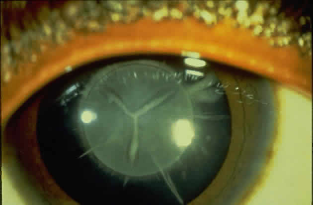 PAX6 has been identified on chromosome 11p13.46,111–113 This gene contains 14 exons, is transcribed as a 2.7-kb mRNA, and encodes a 422-amino-acid protein. PAX6 may function as a transcriptional factor in regulating expressions of other genes in embryogenesis.112 Such an important role for PAX6 as the master control for gene expression in oculogenesis may explain the panocular manifestations in patients with aniridia. Aniridia and PAX6 have provided a valuable model system in the study of molecular mechanisms important in the embryogenesis of the eye. Clinically, prenatal diagnosis can be carried out to detect PAX6 mutations in amniocytes.112 Such detection requires prior characterization of a PAX6 mutation in the family of the proband. In patients with the sporadic form of aniridia, it is important to detect deletions of chromosome 11p13 and the Wilms' tumor locus because these patients may have a 50% risk of Wilms' tumor development. Typically, karyotypes are examined and patients followed up with renal ultrasound. Molecular techniques are becoming available for direct detection of the number of copies of aniridia and Wilms' tumor genes in patients with aniridia, thereby offering a genetic test for the predisposition to Wilms' tumor.114–117 AXENFELD-RIEGER SYNDROME Axenfeld-Rieger syndrome consists of bilateral congenital abnormalities of the anterior segment of the eye associated with abnormalities of the teeth, midface, and umbilicus. Ocular findings include prominent, anteriorly displaced Schwalbe's line (posterior embryo toxon), peripheral iris strands extending to Schwalbe's line, and iris thinning with atrophic holes (Fig. 4). Axenfeld-Rieger syndrome is typically inherited as an autosomal-dominant disorder,118 but 25% of cases are sporadic. There is no sex predilection. Cytogenetic studies have mapped the Axenfeld-Rieger locus to chromosome 4q25.119–123 Based on these linkage studies, a candidate gene located in this chromosomal region that encodes for epidermal growth factor (EGF)124–128 has been chosen. The EGF gene is considered an excellent candidate gene because EGF binds to the tooth, and antibodies to EGF inhibit dental and eye development.125–127 Antisense oligonucleotides to EGF have been shown to block tooth formation in vitro.129 In addition, Raymond and co-workers126 and Jumblatt and associates130 have shown that the corneal endothelium has EGF receptors and undergoes morphologic changes when exposed to EGF.130 However the hypothesis that EGF is the Axenfeld-Rieger gene is yet to be proved because no causative mutations in EGF have been identified to date in patients with Axenfeld-Rieger syndrome. Alternative candidate genes in this chromosome 4q25 region are still being sought.124 CATARACT Hereditary cataract can be transmitted as an autosomal-dominant131 or X-linked trait and can be associated with other ocular findings (e.g., microphthalmia, microcornea) and systemic manifestations (e.g., dental anomalies).96,131–134 The lens opacity is often central in X-linked congenital cataract (Fig. 5). Using RFLP, the locus for X-linked congenital cataract has been mapped to chromosome Xp21.1-22.3.135–137 Many other chromosomal loci have been described for various other types of cataract, including Coppock-like cataract (chromosome 2q33-35),138 Mariner-type cataract (chromosome 16q22),139,140 anterior polar cataract (chromosome 2p25, 14q24,141 and congenital total cataract (chromosome Xp).142,143