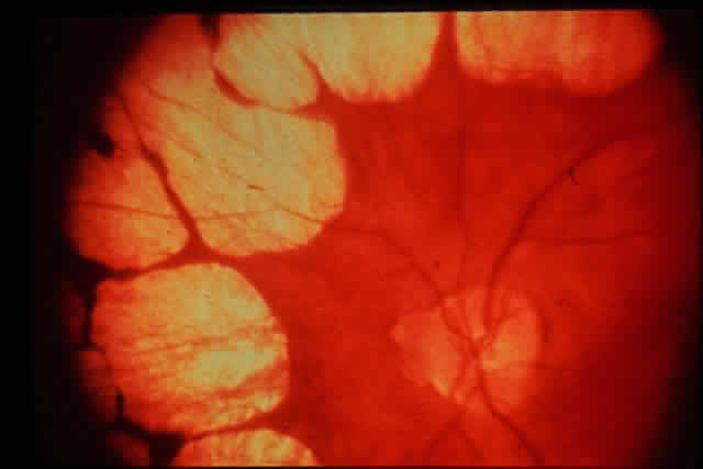 CHOROIDEREMIA The recent discovery of the molecular defect in choroideremia is an excellent example of the power of molecular studies in advancing our understanding of disease pathogenesis. Choroideremia is a hereditary, bilateral, and progressive X-linked retinal degeneration characterized by central blindness in affected males during early adulthood. These patients have hemeralopia, decreased vision, and visual field constriction due to atrophy of the choroid and the retinal pigment epithelium (Fig. 6). One notable characteristic of choroideremia in contrast with other retinal degenerations, such as X-linked retinitis pigmentosa, is that carrier females of choroideremia have a typical fundus appearance consisting of linear retinal pigmentation with punctate area of pigment epithelial atrophy.