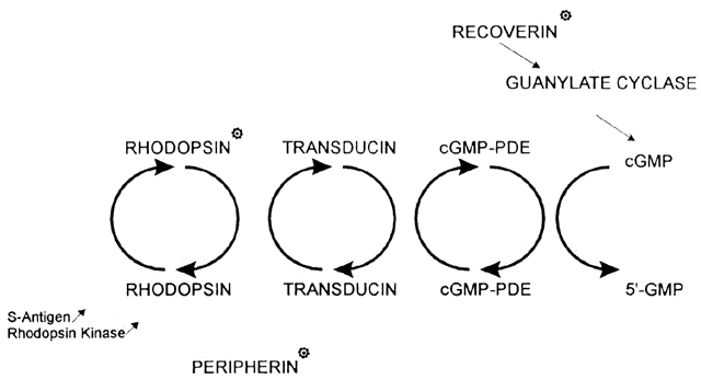 Rhodopsin gene mutations account for approximately 10% of all cases of retinitis pigmentosa, and 25% of all cases of autosomal-dominant cases. In addition to the rhodopsin gene, at least nine other distinct genetic loci have been implicated in retinitis pigmentosa (Table 3). Most of these loci have been identified through linkage studies. Five specific genes have been identified: rhodopsin, peripherin/RDS, the beta-subunit of rod cGMPphosphodiesterase, RP-cGMP channel protein-1, and the ROM1 genes. The explanation for the involvement of multiple proteins in this disease process may lie in the fact that since there are many proteins involved in the visual transduction pathway (Fig. 15), mutations and therefore loss of function of any of the critical proteins may lead to the same end result: photoreceptor degeneration. In addition to monogenic inheritance, there is recent evidence of a digenic inheritance of retinitis pigmentosa87 in which only those persons who are doubly heterozygous for both peripherin/RDS and ROM1 loci are affected. Biochemically this is particularly intriguing, since these two proteins appear to interact through noncovalent binding, which is responsible for the structural stability of the photoreceptor outer segment disc.